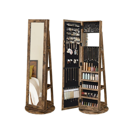 Voir le produitArmoire à bijoux pivotante à 360°verrouillable, avec miroir intérieur, étagères de rangement à l'arrière, Marron Rustique