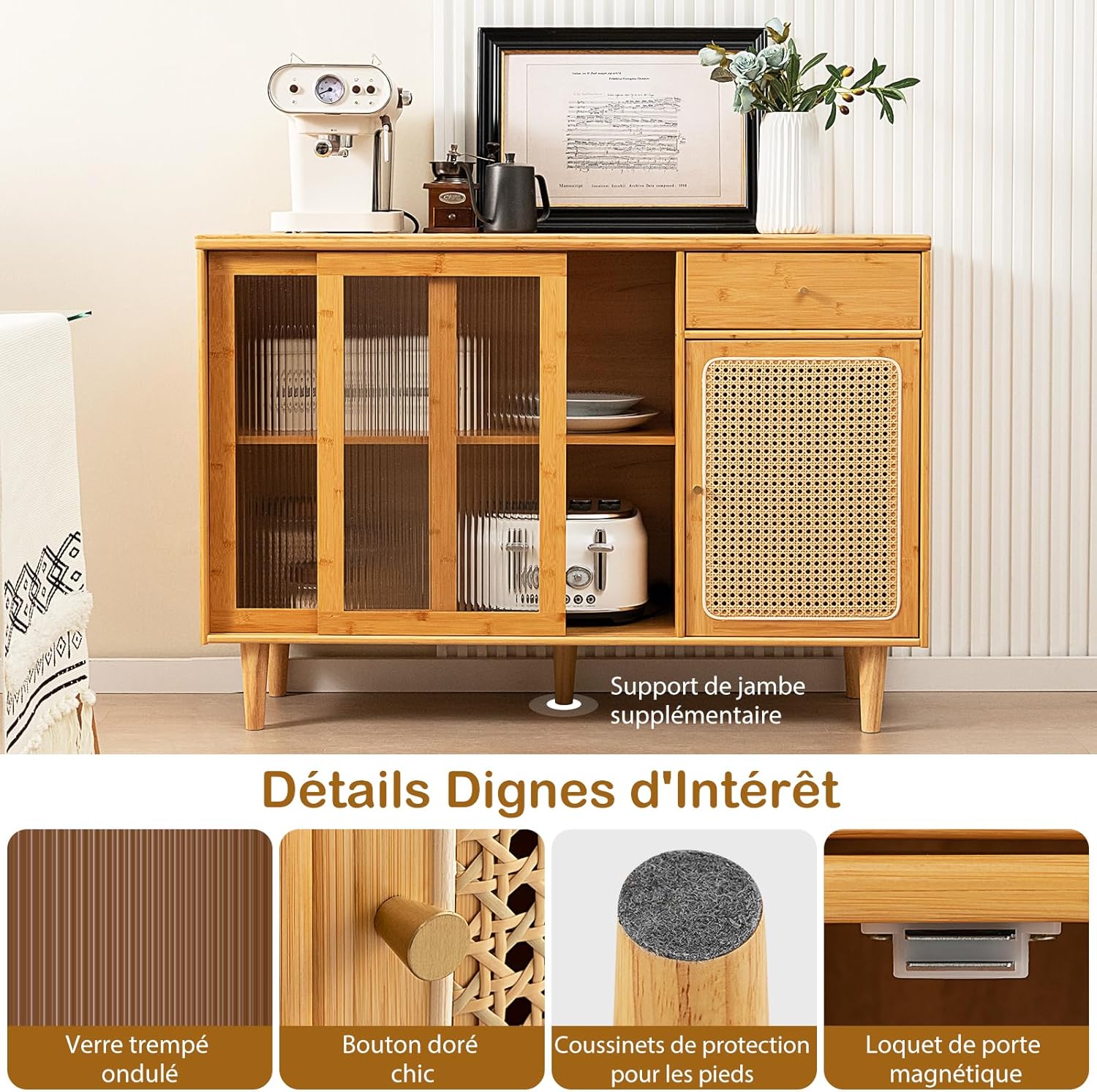 Ses portes vitrées en verre trempé avec motif ondulé ajoutent une touche contemporaine et sophistiquée à votre intérieur. Profitez d'un espace de rangement spacieux grâce à son tiroir coulissant, son cabinet à porte coulissante et son cabinet à porte en rotin, parfaits pour organiser vos ustensiles de cuisine, bouteilles de vin ou objets décoratifs.