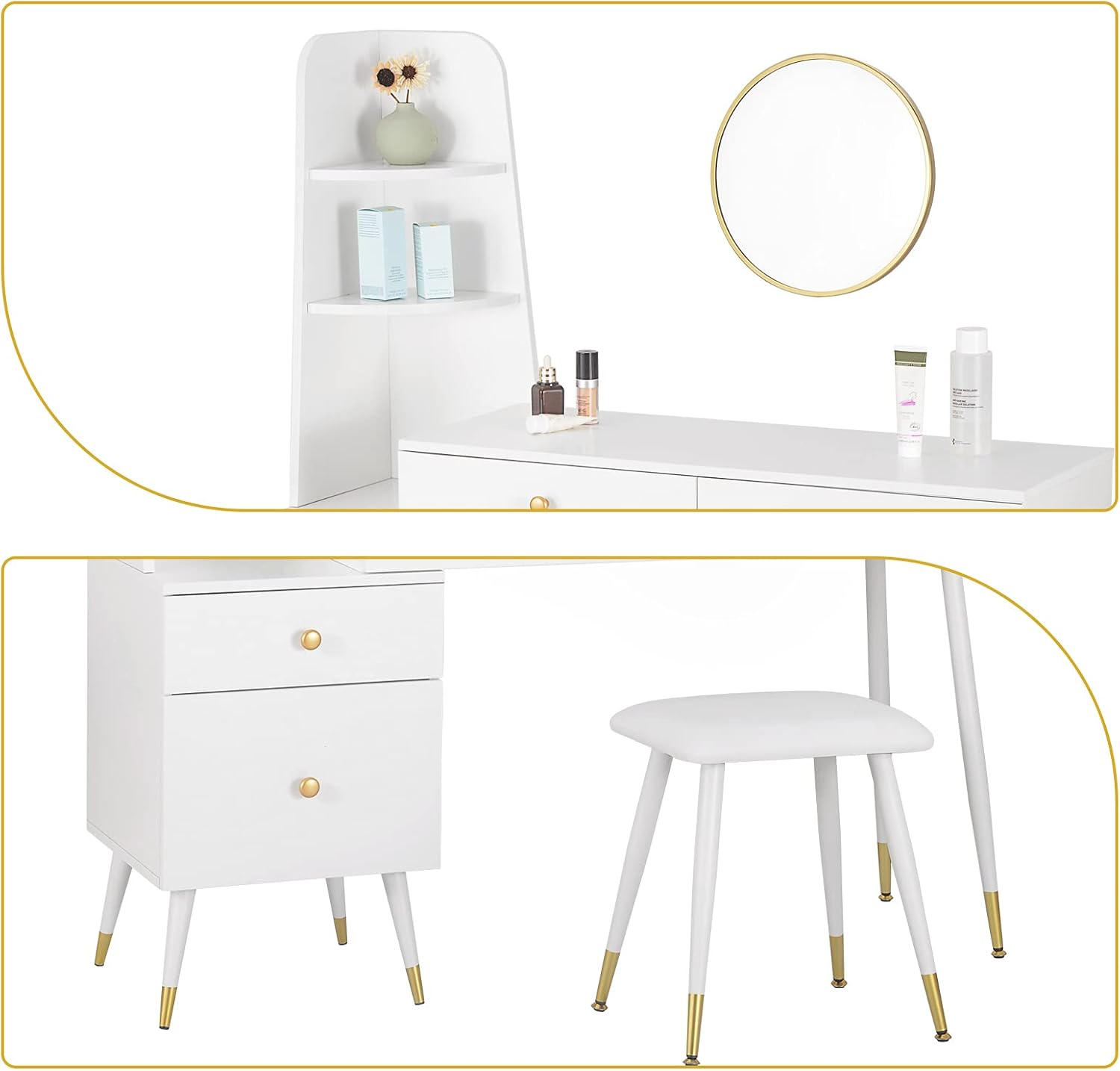 • Composants inclus : Table de coiffeuse, tabouret, commode, étagère de rangement, miroir