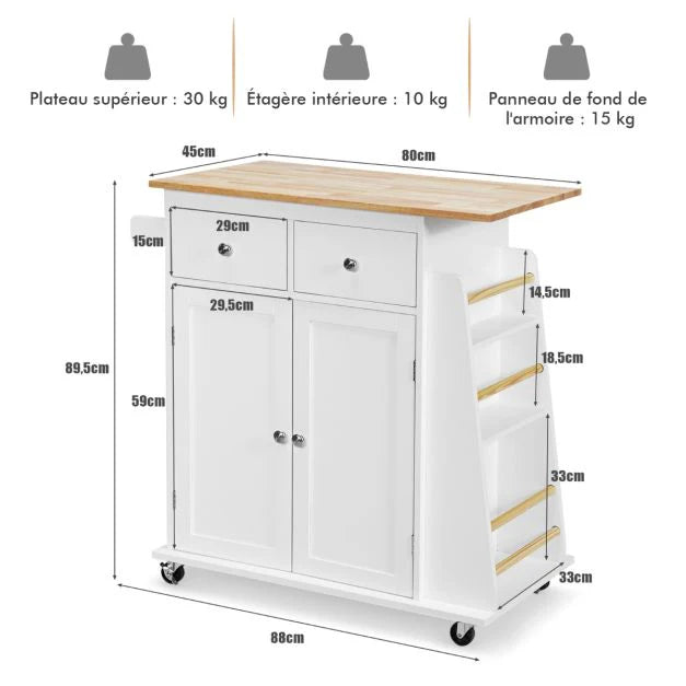 Transformez votre cuisine avec la "Desserte de cuisine sur roulettes avec plateau en bois d'hévéa", un chariot mobile et polyvalent conçu pour optimiser votre espace culinaire. Profitez d'un plan de travail spacieux en bois d'hévéa, idéal pour la préparation des repas ou le placement d'appareils électroménagers.