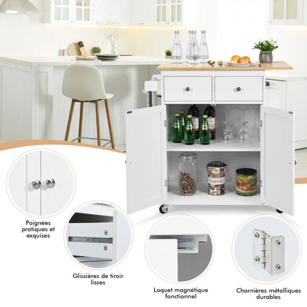 Desserte de Cuisine sur Roulettes avec Plateau en Bois d'Hévéa