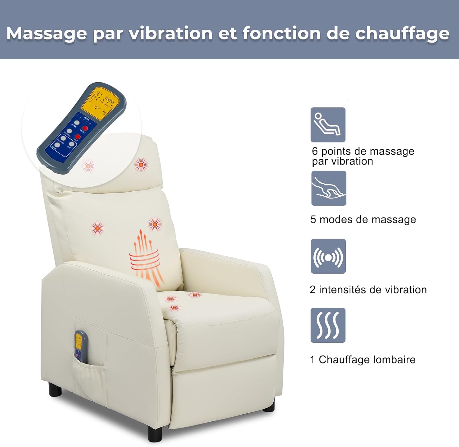 Découvrez le summum de la détente avec le "Fauteuil relaxation Massage inclinable", un fauteuil moderne conçu pour apaiser les tensions musculaires et améliorer la circulation sanguine. Grâce à ses quatre points de massage avancés dans le dossier et deux points vibrants dans l'assise, il offre une expérience thérapeutique complète.