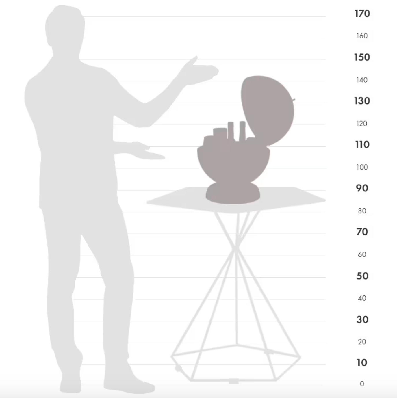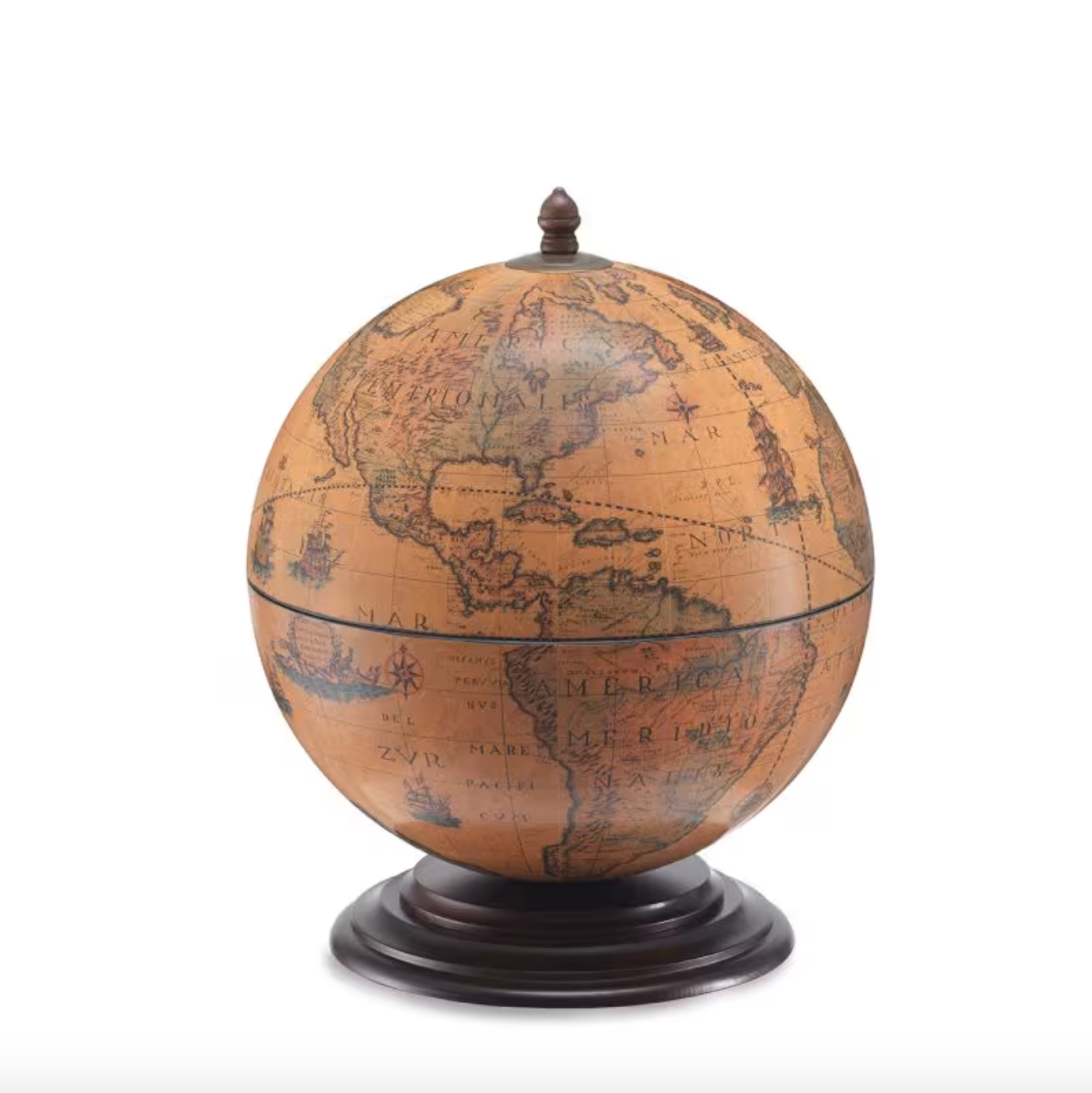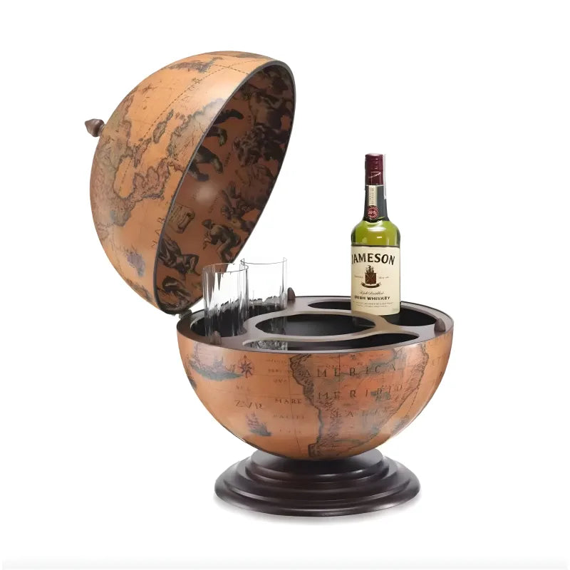Compact mais spacieux, il peut accueillir jusqu'à neuf verres et deux à trois bouteilles, tout en optimisant l'espace grâce à sa taille réduite. Idéal pour les amateurs d'histoire ou ceux qui apprécient une décoration vintage sophistiquée, ce globe bar est également une idée cadeau unique et distinguée.