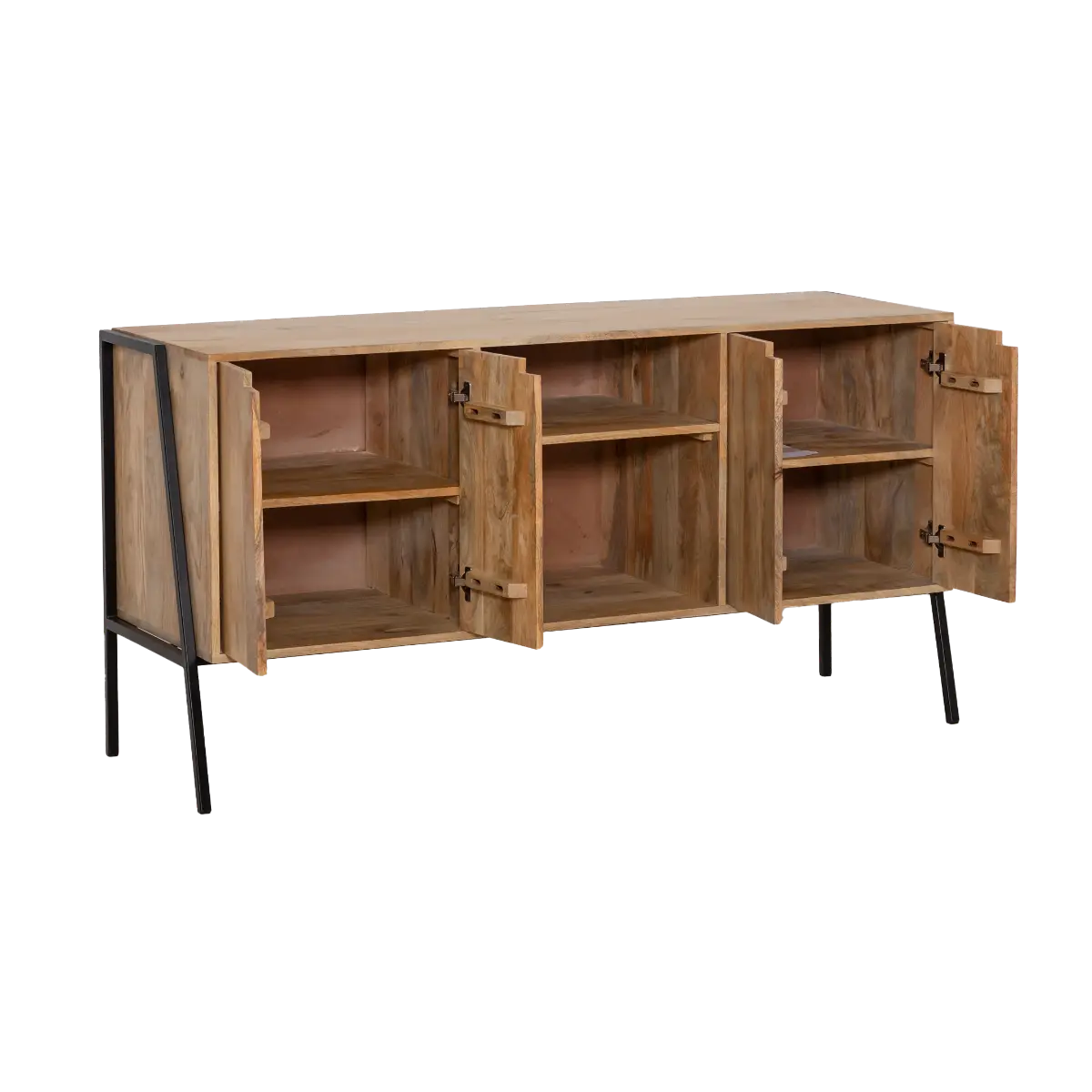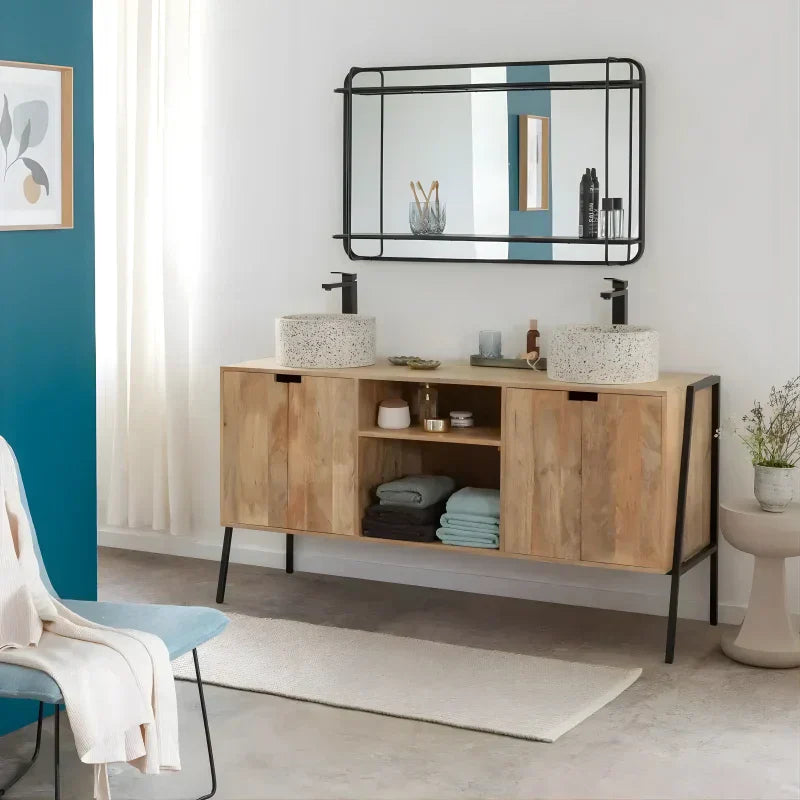 Découvrez le meuble sous vasque en bois de manguier et métal, une pièce maîtresse qui allie la chaleur du bois exotique à l'élégance moderne du métal. Ce meuble est conçu pour transformer votre salle de bain avec son esthétique industrielle subtile, tout en offrant une solution de rangement polyvalente grâce à ses deux grandes zones de stockage fermées et ses niches ouvertes.