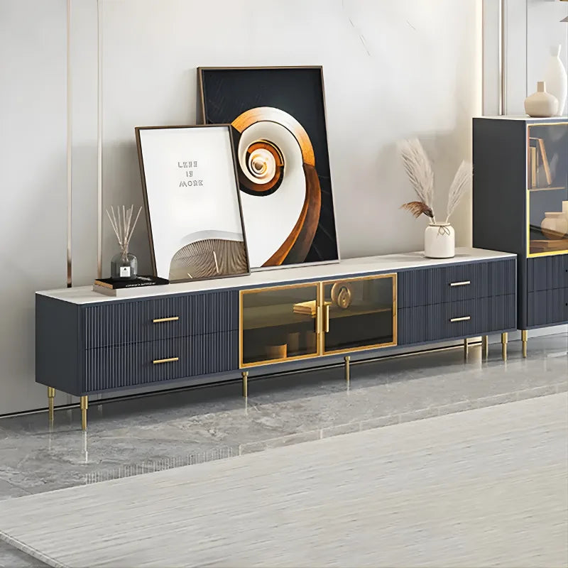 Sa conception rainurée contemporaine s'intègre parfaitement à divers styles décoratifs, tandis que sa robustesse garantit une utilisation pérenne. Offrant un vaste espace de rangement grâce à ses quatre tiroirs et deux étagères, il est idéal pour organiser vos appareils multimédia avec aisance.