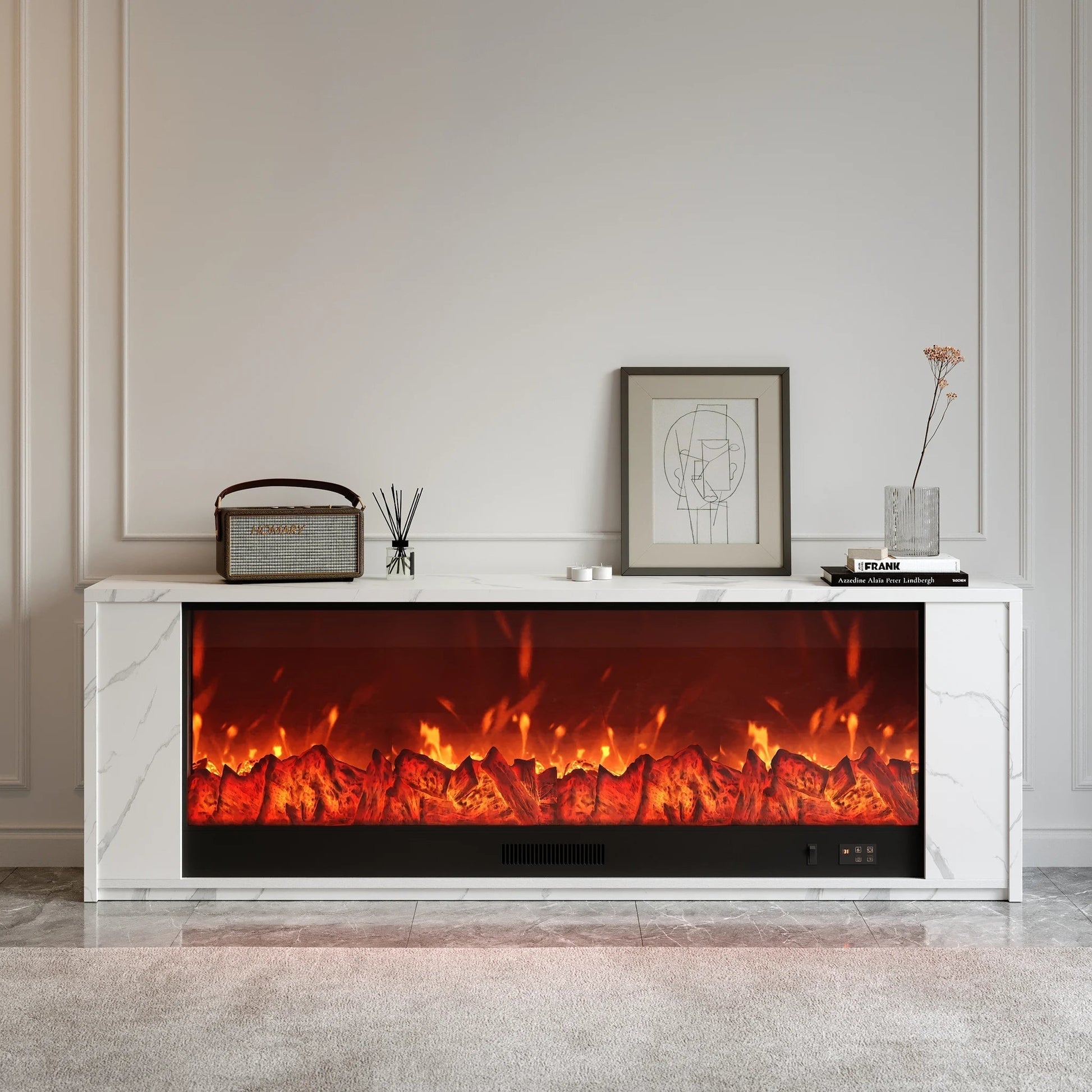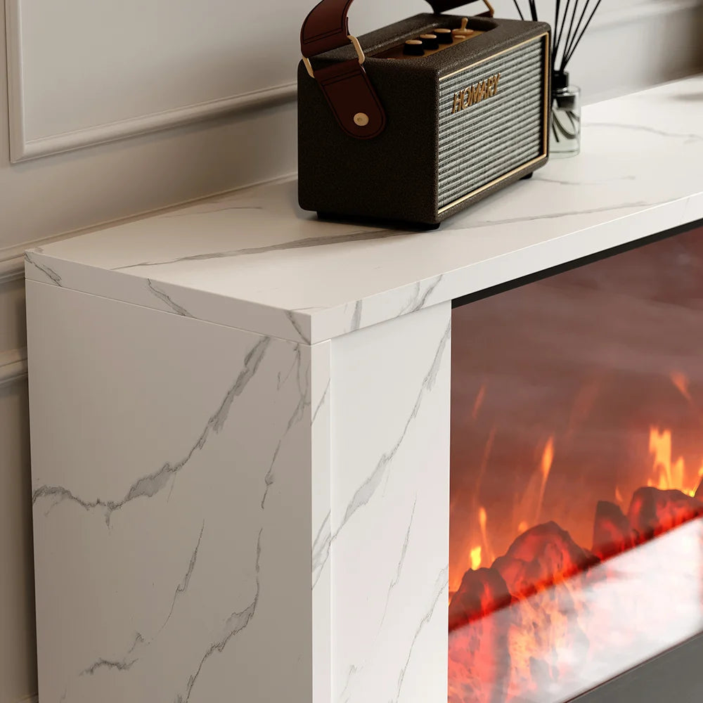 Transformez votre espace de vie avec notre meuble TV moderne en verre, doté d'une cheminée électrique intégrée. Ce bijou de design contemporain allie l'élégance d'une surface en marbre haut de gamme à la chaleur conviviale d'une cheminée sans les inconvénients traditionnels.