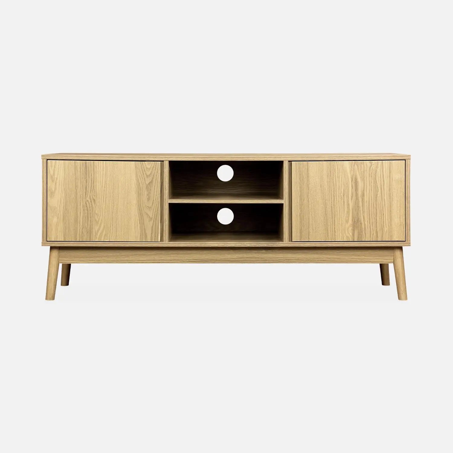 Découvrez le charme intemporel du Meuble TV effet bois - 2 portes 120 cm, une pièce maîtresse pour votre salon qui allie esthétique scandinave et fonctionnalité moderne. Avec sa finition effet bois et ses élégantes jambes rétro, ce meuble offre un espace de rangement généreux grâce à ses deux niches et niveaux intégrés, parfait pour organiser vos accessoires high-tech.