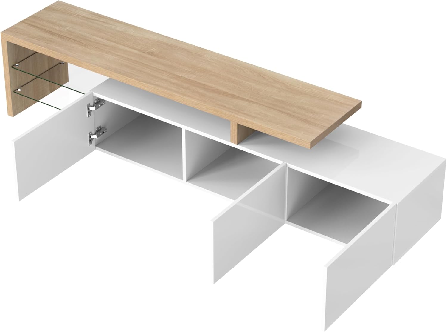 Mesurant 197,5 cm de long, il offre un espace généreux pour votre télévision et vos appareils multimédias, tout en intégrant des surfaces blanches élégantes et des tons bois chaleureux qui s'adaptent à tous les intérieurs. Les étagères en verre ajoutent une touche d'élégance tandis que l'éclairage LED à sept couleurs crée une ambiance personnalisable selon vos envies.
