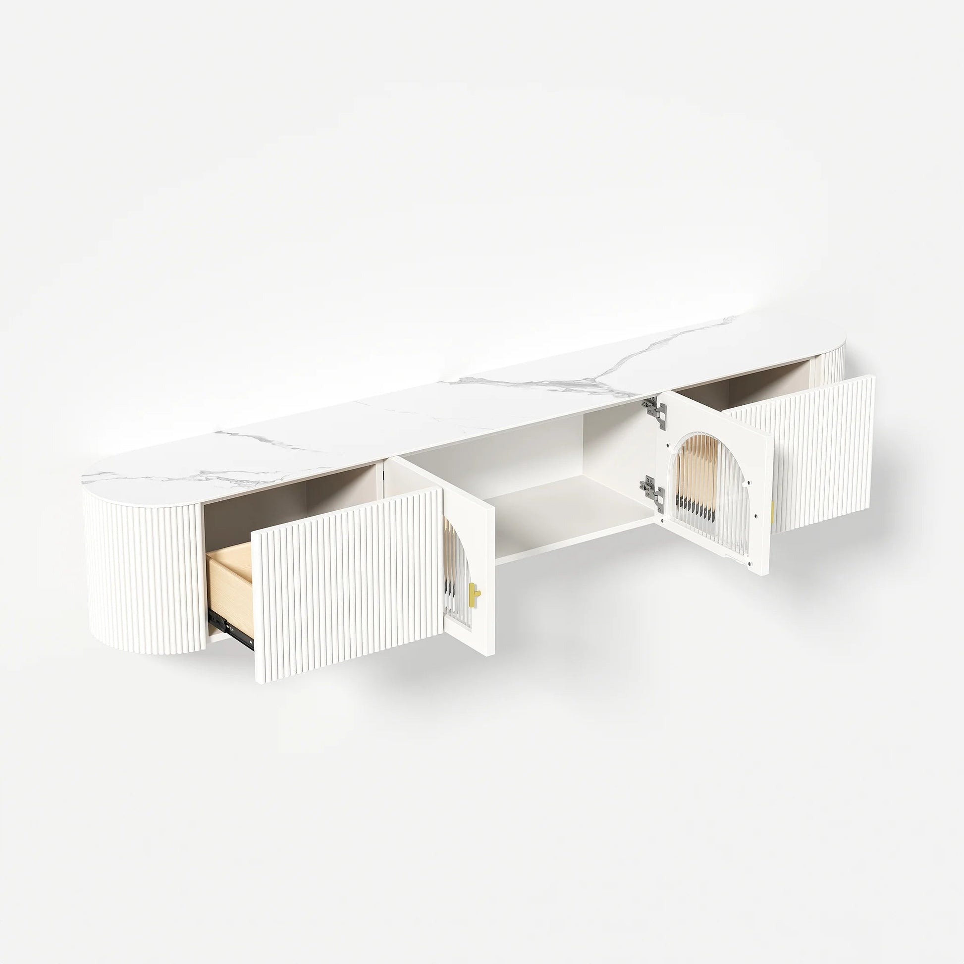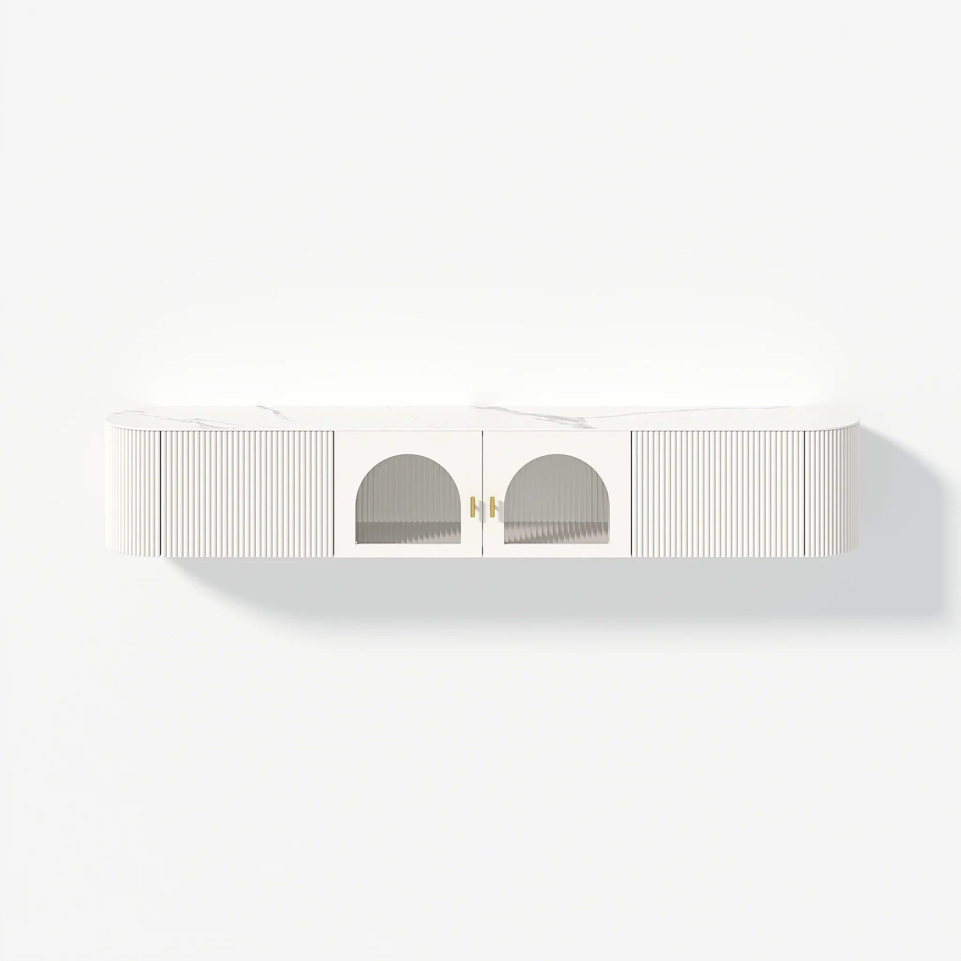 Transformez votre salon avec le Meuble TV Murale Flottant en Pierre Frittée Blanche, un mariage parfait entre élégance et fonctionnalité. Doté de portes en forme d'arche qui apportent une touche sophistiquée, ce meuble offre un espace de rangement généreux pour vos accessoires multimédia tout en libérant votre sol grâce à sa conception murale.