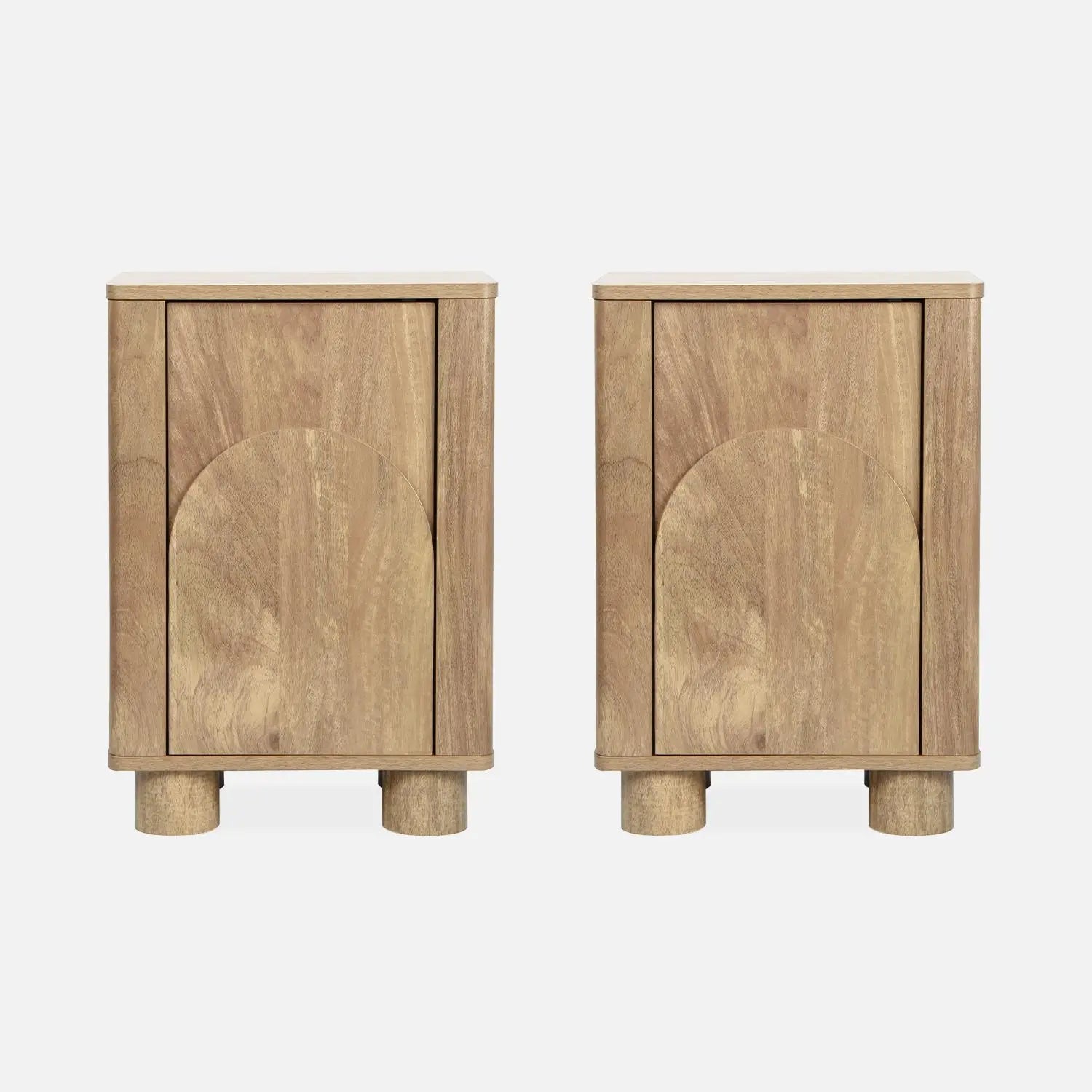 Leur finition en bois naturel façon manguier et leurs pieds arrondis apportent une chaleur naturelle qui s'intègre parfaitement à divers décors. Chaque table, dotée d'une porte texturée et d'une étagère intérieure, offre un espace de rangement pratique pour vos essentiels nocturnes, tout en supportant jusqu'à 30 kg.